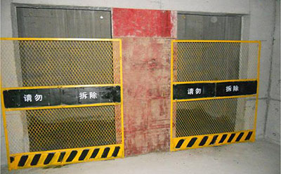 在電梯未安裝正式防護(hù)網(wǎng)之前,任何人不得擅自拆除改動(dòng)電梯井防護(hù)網(wǎng),嚴(yán)禁利用電梯井作為垃圾通道,嚴(yán)禁任何人扶、靠電梯井防護(hù)網(wǎng)或?qū)㈩^探入電梯井內(nèi),以及嚴(yán)禁在電梯井防護(hù)網(wǎng)上靠置、擺放任何材料、物件。